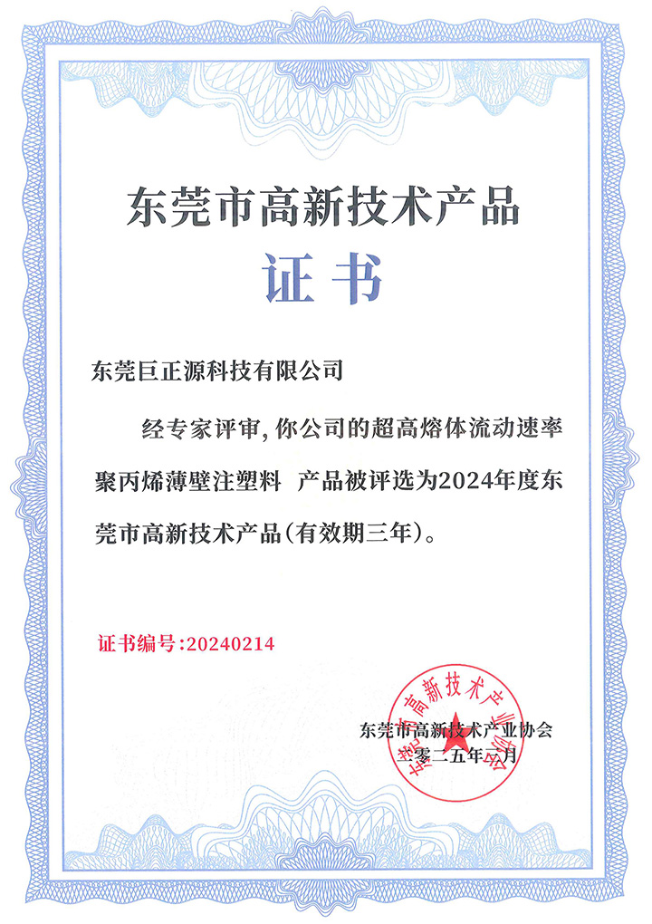 日前,東莞市高新技術(shù)產(chǎn)業(yè)協(xié)會(huì)公布了2024年?yáng)|莞市高新技術(shù)產(chǎn)品名單。東莞巨正源科技有限公司自主研發(fā)、生產(chǎn)的超高熔體流動(dòng)速率聚丙烯薄壁注塑料產(chǎn)品成功入選,被評(píng)選為2024年度東莞市高新技術(shù)產(chǎn)品,有效期三年。